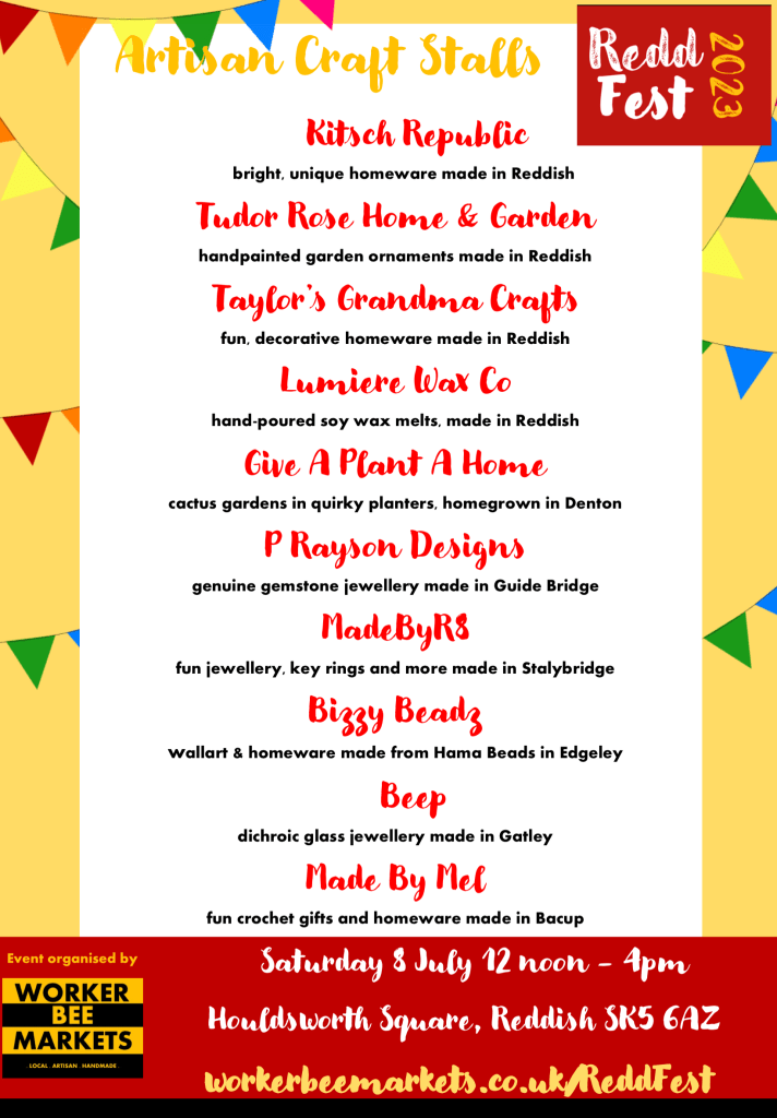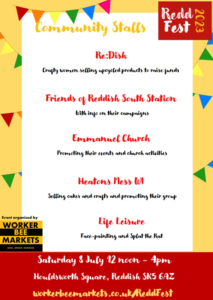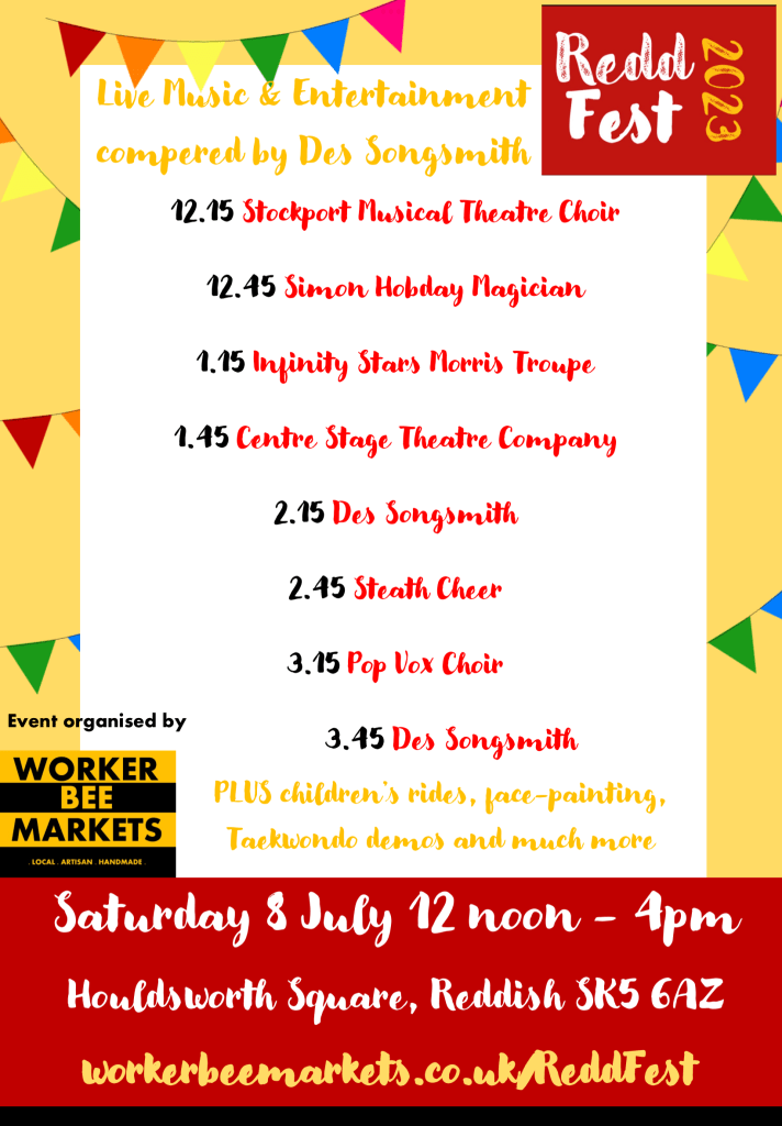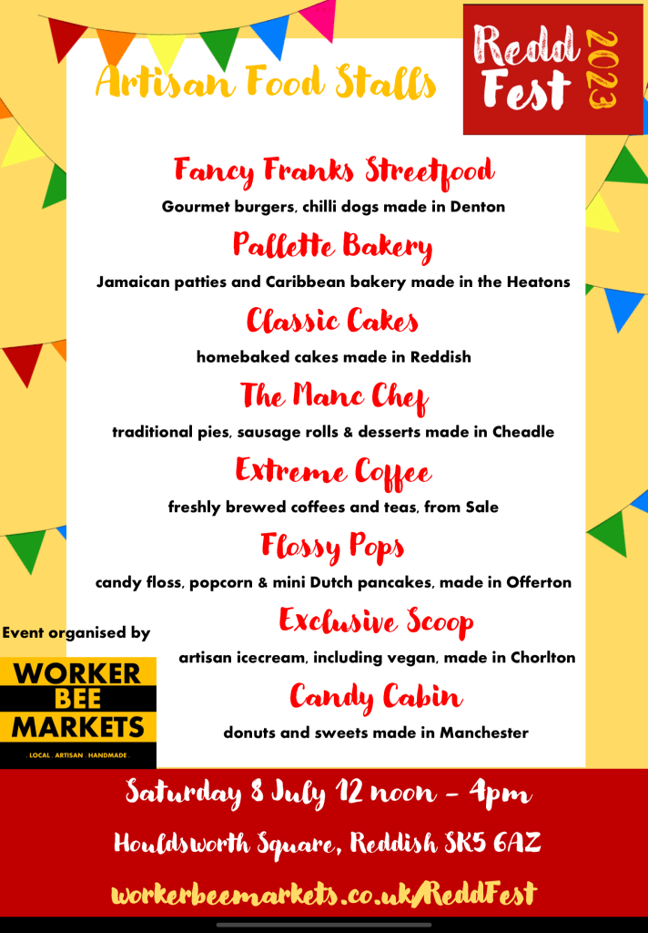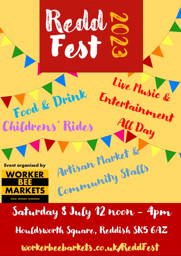 In 2023, Worker Bee Markets was invited to run ReddFest, a community Festival in the heart of Reddish. The festival ran successfully from 2011 to 2019, (then Covid cancelled everything). So this year, we wanted to celebrate the return of ReddFest with a day to remember.